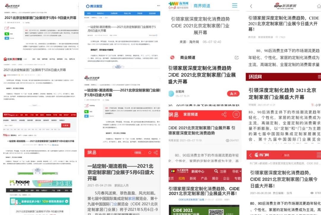 2021北京定制家居門業(yè)展得到百余家行業(yè)權(quán)威媒體助力,從展前到展中均在手機(jī)端、PC端大幅報道本屆展會。包括:新浪家居、騰訊家居、搜狐焦點家居、房天下、鳳凰網(wǎng)家居、太平洋家居網(wǎng)、人民日報海外網(wǎng)、環(huán)球網(wǎng)、九正建材網(wǎng)、中華木門網(wǎng)、中華門窗網(wǎng)、中國木門網(wǎng)、美家網(wǎng)、齊家網(wǎng)、慧聰網(wǎng)家居、大眾網(wǎng)家居、中國建材商網(wǎng)等等。
